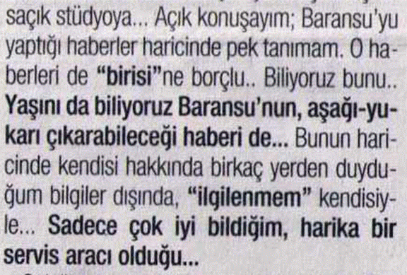 Baransu’nun sadece bir “servis aracı” olduğunu bir kaç defa tekrarladıktan sonra aynen şunları söylüyor: