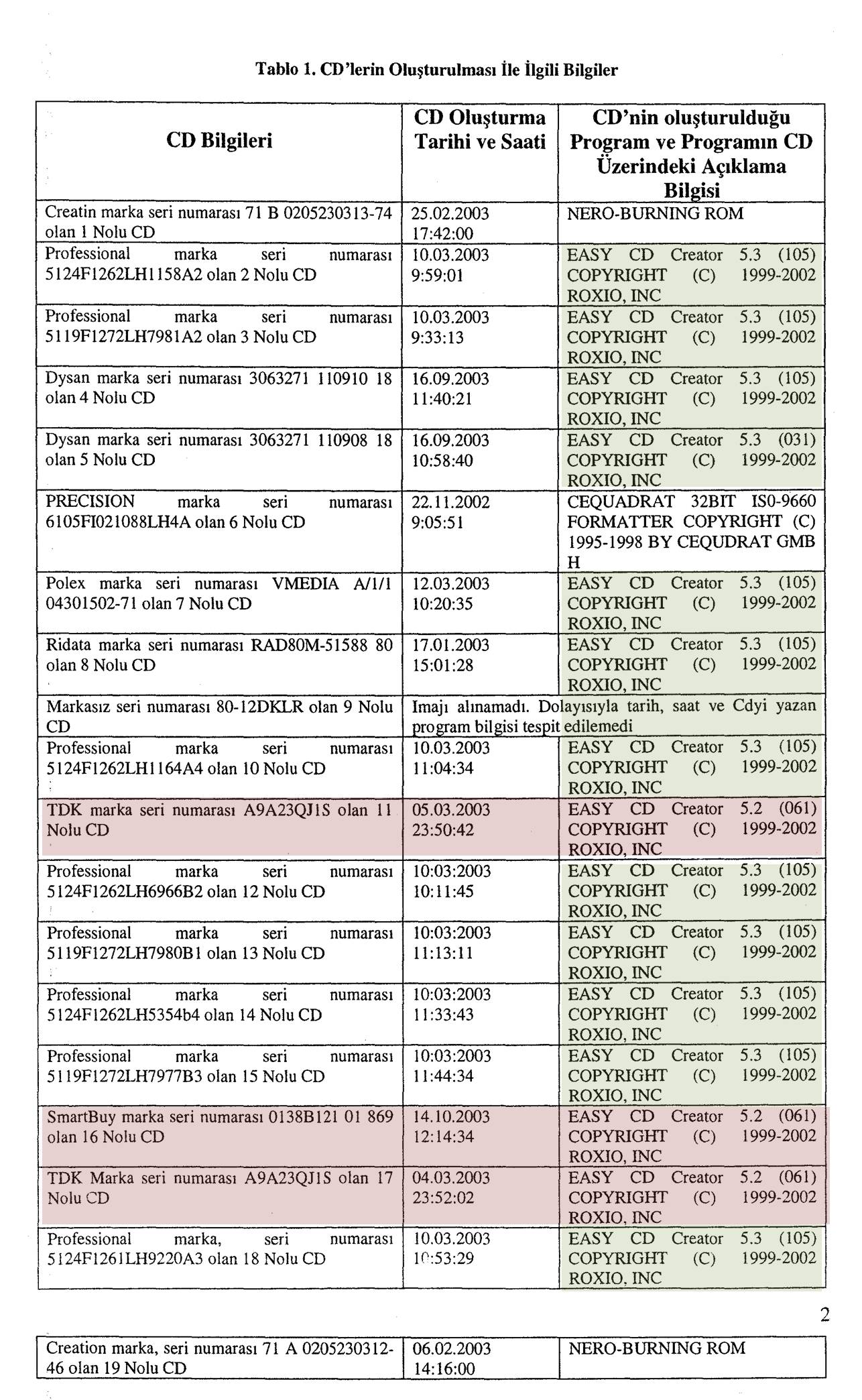 2,3,4,5,7,8,9,10,12,13,14,15, ve 18 no.lu CD’ler Easy CD Creator 5.3 (105) ile kaydedilmişken, 11,16, ve 17 no.lu CD’ler Easy CD Creator 5.2 (061) ile kaydedilmiş. Aynı markaya ait, iki farklı sürüm. Teknik olarak bu iki programdan “aynı program” diye bashedilmesi mümkün değil. Aynen Microsoft Word 2000 ile Microsoft Word 2004’ten aynı program diye bashedilemeyeceği gibi. Teknik bilirkişi vasfındakilerin bunun ayırdında olmaması ihtimali de yok.