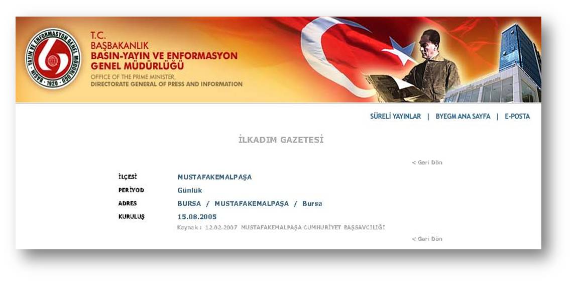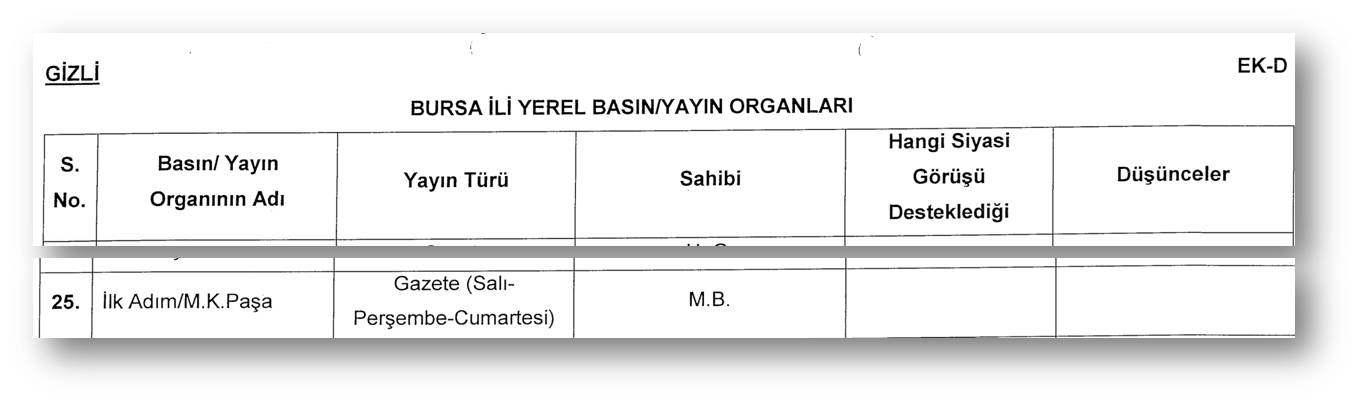 Yine 11 no.lu “Balyoz” CD’sindeki belgelerden birinde (EK-D BASIN YAYIN ORGANLARI 29.01.03.doc) adı geçen Bursa Mustafakemalpaşa’daki yerel gazete “İlk Adım,” aşağıda görüldüğü üzere 15 Ağustos 2005’te kurulmuş. Halbuki bu belge, 5 Mart 2003’te Çetin Doğan icin özel olarak oluşturulduğu iddia edilen (ve bütün suç unsurlarının toplandığı) CD’den çıkıyor.