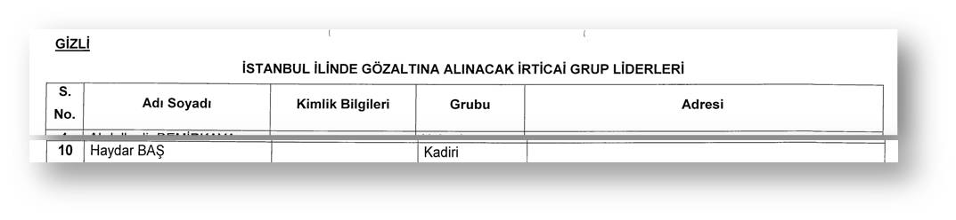 Peki, yine 11 no.lu CD’den çıkan Balyoz belgesine göre (Dava Klasörü no. 184, Dizin no. 216), İstanbul İlinde Gözaltına Alınacak İrticai Grup Liderleri listesinde 10. sıradaki kişi kim? Haydar Baş.