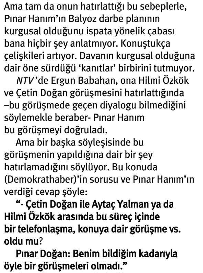 Miroğlu’nun Demokrathaber kaynaklı olarak belirttiği söyleşide ise Selin Ongun, Balyoz soruşturma sürecinde Doğan ve Yalman ya da Özkök arasında görüşme olup olmadığını sordu (söyleşinin aslı t24.com.tr’de yayımlandı; tamamına buradan erişebilirsiniz.)