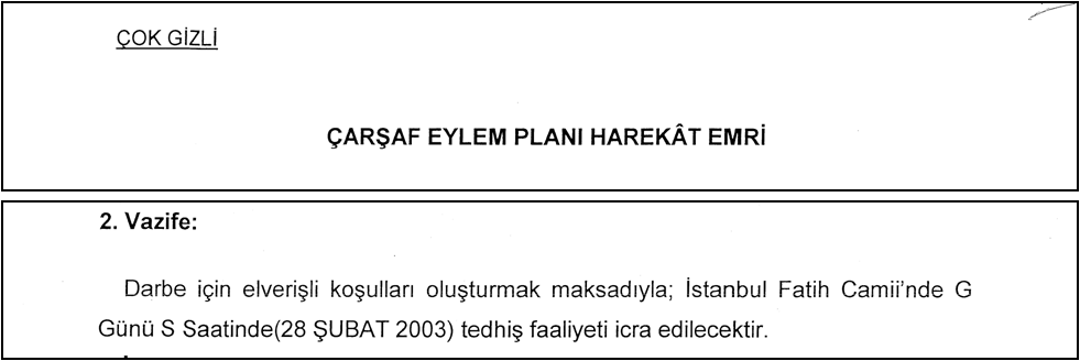 Aşağıda verdiğimiz kesitler, “Çarşaf Eylem Planı Harekat Emri.doc“ isimli belgeden (Gölcük Klasörleri, no. 5, dizin no. 73-78). Aynı ifadeler, birebir şekilde Sakal planında da var (Gölcük Klasörleri, no. 5, dizin no. 82-87). Üstverilerine göre bu belge ilk olarak 16.02.2003’de, son olarak 22.02.2003’de, kaydedilmiş (Gölcük Klasörleri, no. 5, dizin no. 127).