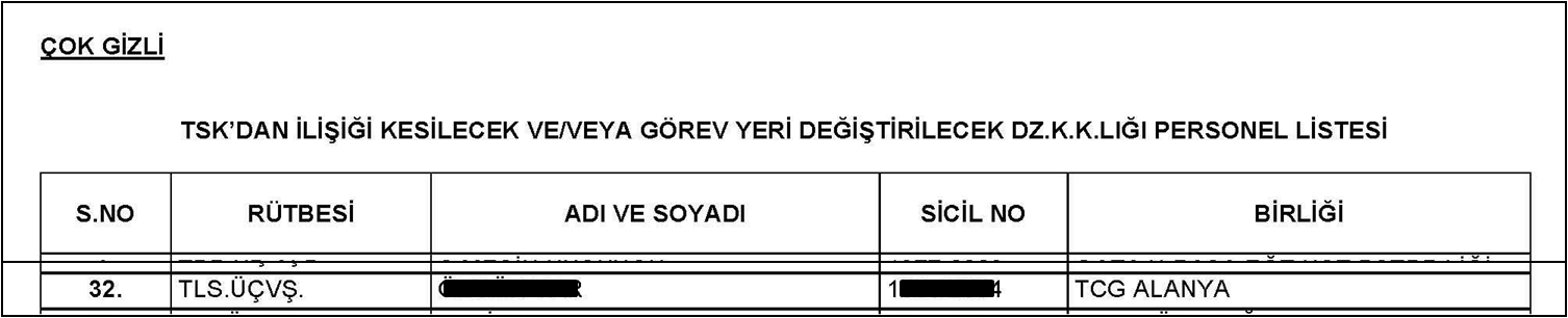 TSK’dan ilişiği kesilecek ya da görev yeri değiştirilecek 36 kişinin listelendiği bu Suga belgesinde  32. Sıradaki personelin çalıştığı birlik olarak TCG ALANYA yazıyor.