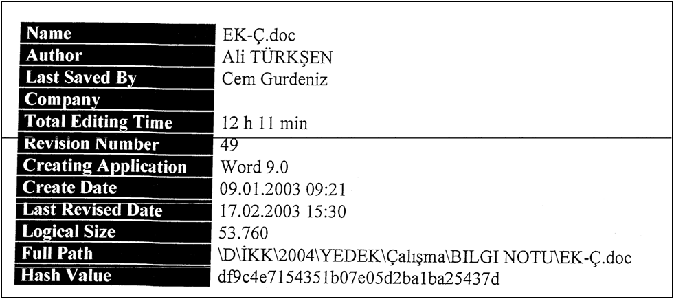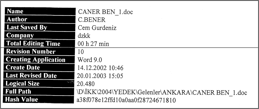 Burada asıl sorulması gereken: “Bu dosyalar harddisk normal kullanımdayken mi kaydedildiler?” sorusu olmalıdır. Bu dosyalar eğer bilgisayar aktif kullanımdayken kaydedildiyse, sistem üzerinde başka izler de bırakmış olma ihtimali çok yüksektir. Onlara bakarsınız. Bu raporda örneğin “recent documents” ve eski/silinmiş (kurtarılan) dosyalara bakılmış ve bu şüpheli dosyaların izine rastlanmamış. Önemli delillerden bir tanesi, bu dosyaların normal kullanılan bir sistemde bırakacağı izlerin disk üzerinde veya içeriğin kopyalandığı yerlerde bulunmaması. Yüzlerce şüpheli dokümandan en azından birkaç tanesinin bu şekilde “iz bırakmış” olması gerekirdi. Bu yöndeki diğer somut belirtiler: şüpheli dosyalarda MAC adresleri bulunmaması ve kullanıcı adının farklı olması. Bütün bunlar, dosya içeriğindeki zaman tutarsızlıkları da göz önüne alındığında, bu dosyaların sonradan eklendiği sonucuna götürüyor.