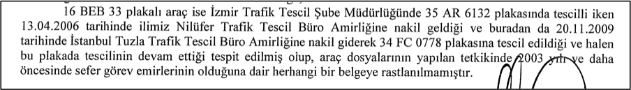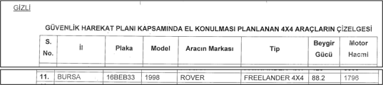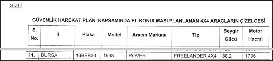 Ancak, belgenin 11nci sırasında 98 model, 16 BEB 33 plakalı bir araç görünüyor ve belgenin sözde yazıldığı tarihte Bursa’da boyle bir araç yok. Rover Freelander marka bu araç, o tarihte İzmir’de bulunuyor ve 35 AR 6132 plaka numarasıyla kayıtlı. Bu araç Bursa’ya 13 Nisan 2006’da nakledilerek belgede geçen plaka numarası ile tescil ediliyor.