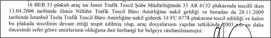 Yapılan sorgulamalar, çeşitli il ve ilçelerin Emniyet Müdürlüğü’nden gelen ve emanate kaldırılan yazılar. Bu cevabi yazılarda araçların sadece tescil tarihleri değil, aynı zamanda kimlerin adına tescilli olduğu da belirtiliyor. Bu araçların kimisinin gayrimüslilm vatandaşlara ait olduğu saptamasını aynı cevabi yazılar üzerinden yapan ve bunu iddianameye koyan savcılar, her nasılsa, belgedeki aracın belgede belirtilen plakasını 2006’da aldığı “detayını” atlıyorlar.