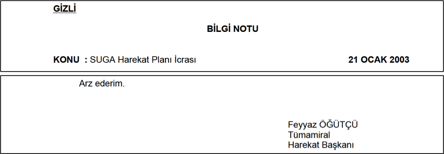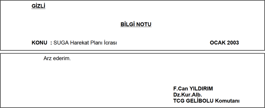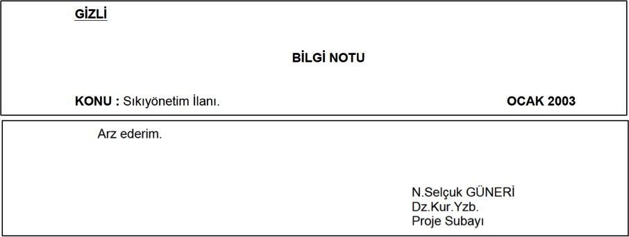 Örnek 3: “SKY Teşkilat.doc” isimli belgeyi görünürde hazırlayıp arz eden N. Selçuk Güneri, 2003 yılında Yarbay olmasına rağmen, belgenin altına adını yazarken kendisini iki rütbe tenzil ederek Yüzbaşı olarak belirtmiş .