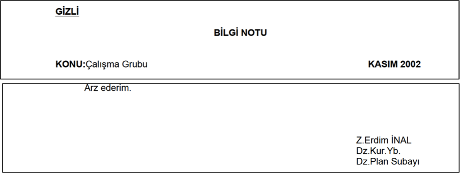 Örnek 1: “Hrp.Ak.Plan Çalışma Grubu.doc” isimli belgeyi görünürde hazırlayan kişi Z. Erdim İnal. Ancak kendisi o dönem henüz Yüzbaşı olmasına rağmen, kendisine çok sonradan terfi edeceği Yarbay rütbesini yakıştırmış.