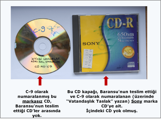 Tutanağa göre, 9 numarası verilen CD’nin markası Sony. Bu CD’nin üzerinde “Vatandaşlık Taslak,” ve yeşil kalemle 67 yazılı.