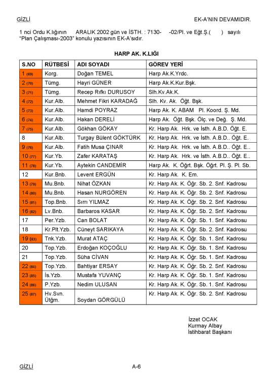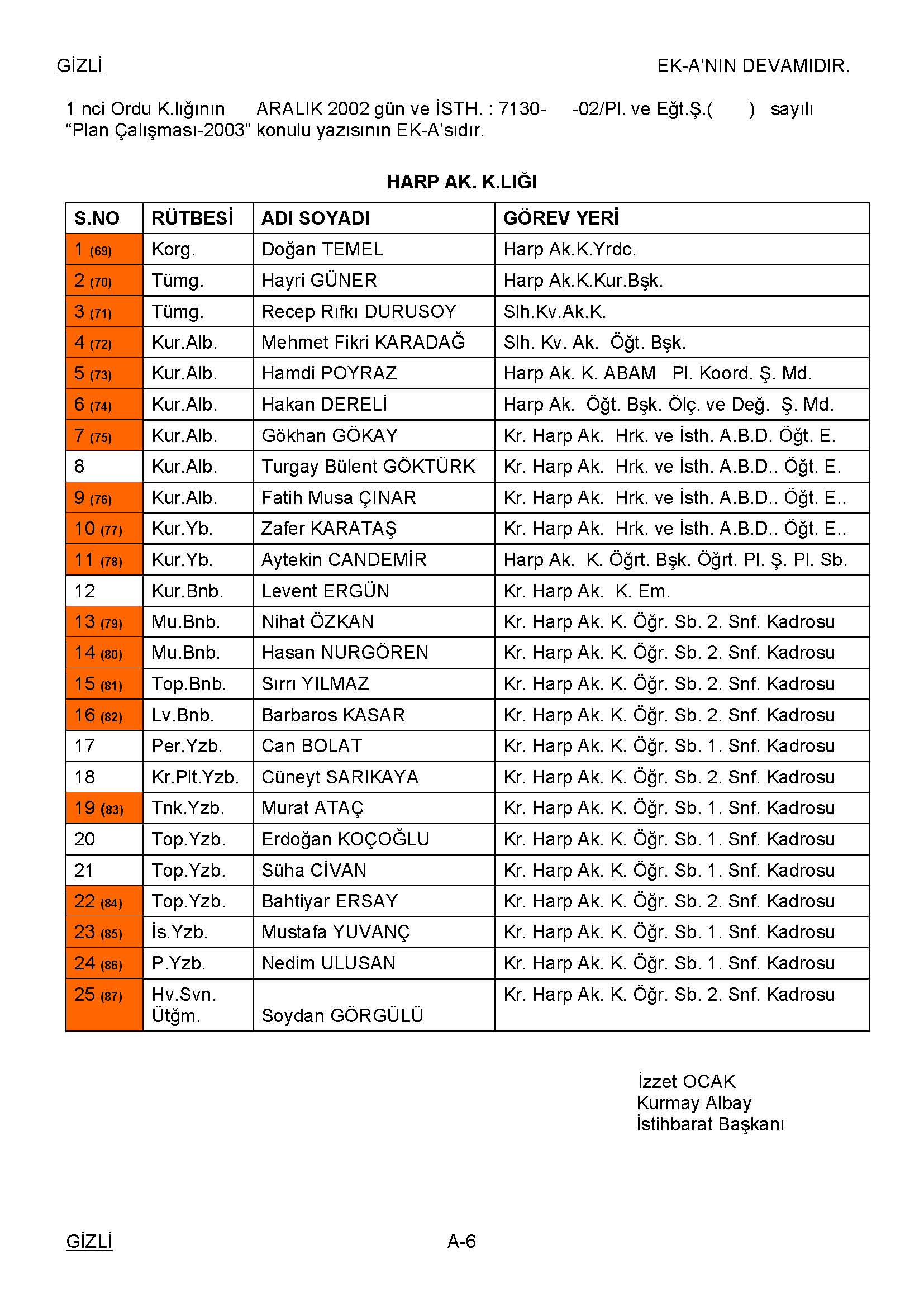 Aşağıdaki liste, dönemin Harp Akademileri Komutanlığı’ndan EK-A.doc’a adı konanlar (listede turuncu ile işaretlediklerimiz Balyoz sanıkları; parantez içinde sanık numaralarını koyduk). Görüldüğü gibi, sanık sıralaması EK-A.doc’da listelenen kişilerin sırasını takip ediyor.