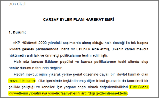 Sakal ve Çarşaf Eylem Planı Harekat Emirlerinin (EPHE) sonradan düzenlenmiş sahte belgeler olduğunu gösteren en çarpıcı bulgularla başlayalım. Aşağıda vereceğimiz kesitler ÇARŞAF EYLEM PLANI HAREKAT EMRİ.doc’dan, ancak, aynı ifadeler, birebir olarak SAKAL EYLEM PLANI HAREKAT EMRİ.doc’da da geçiyor.