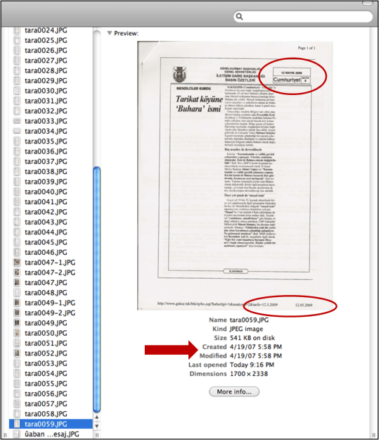 Ancak, bu klasördeki yine sözde 19 Nisan 2007 tarihinde taranarak oluşturulmuş Tara0059.jpg dosyasını açıtığınızda 2009 tarihli bir basın küpürü görüyorsunuz! 12 Mayıs 2009 tarihinde Cumhuriyet gazetesinde yayımlanmış bir gazete küpürü, Genelkurmay tarafından yine aynı tarihte hazırlanan basın özetinde alıntılanmış. Bu JPG dosyasının üstverisine inanacak olursanız, bu gazete küpürü 19 Nisan 2007’de saat 17:58’de taranarak JPG dosyası haline getirilmiş!