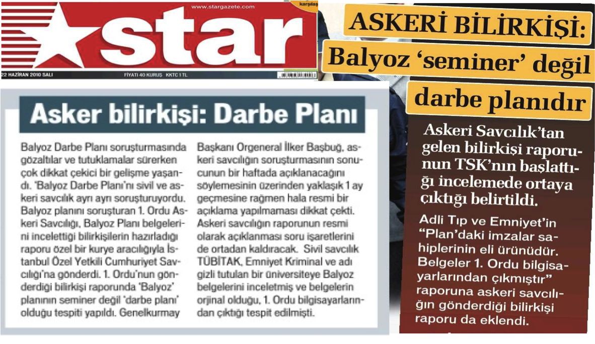 “Gerek Emniyet Kriminal ve gerekse (ve en önemlisi) TÜBİTAK, teknik inceleme sonucu belgelerin gerçekliği hükmüne vardı. Bu hükme, 1.Ordu Askeri Savcılığı bilirkişileri tarafından da varılmış durumda. Ve bu belgelerin içeriğinin “seminer değil düpedüz darbe planı” olduğu “askeri yargı” içinde addedilecek olan ve bizzat planın hazırlandığı kurumun savcılığınca belirleniyor.