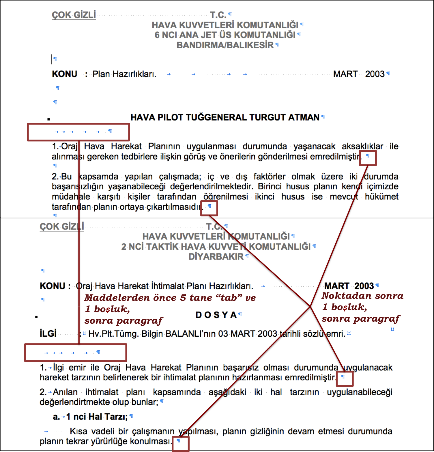 • Bu Word belgelerinde görünmeyen öğeler birebir örtüşüyor. Örneğin, aşağıda görüleceği üzere, güya yazıları hazırlayan farklı kişiler, maddelerin sıralanacağı paragrafa geçmeden önce aynı șekilde 5 kere “tab” sonra bir kere boşluk tuşuna basmış. Ayrıca, bu Word dokümanlarının en sonunda belgelerin yazıldığı karakter olan ‘Arial’dan farklı olarak ‘Times New Roman’ formatında boşluklar var. Bu ve benzeri örtüşmeler, ancak print edilmeyen karakterlerin görüntülenmesi ile ortaya çıkıyor.