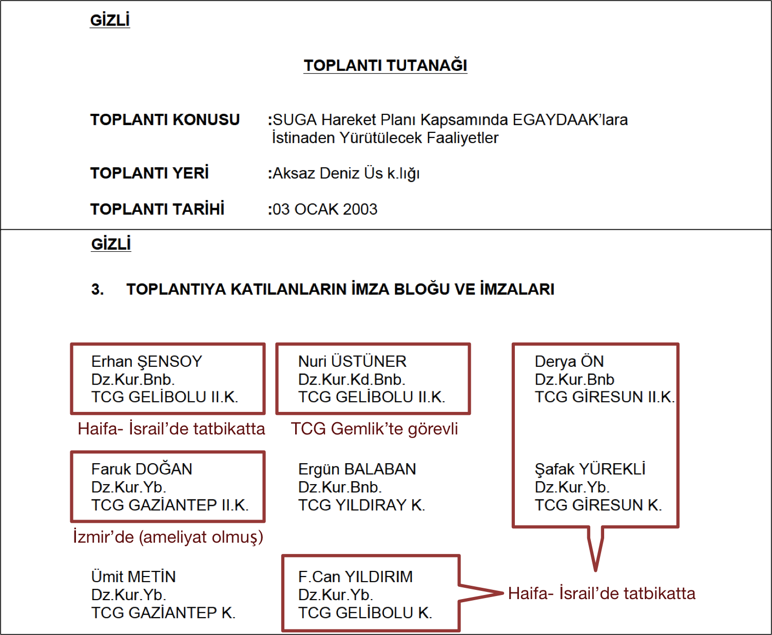 Ümit Metin’in adı aynı zamanda Toplantı Tutanğı.doc isimli Word belgesinde geçiyor. Bu belgeye göre Metin ve 7 başka subay 3 Ocak 2003’de Aksaz’da darbe amaçlı toplantı yapmış ve toplantı tutanağı tutmuşlar. Oysa toplantıya katılmış gibi listelenen 4 subay o tarihte İsrail’de tatbikatta, bir diğeri İzmir’de.