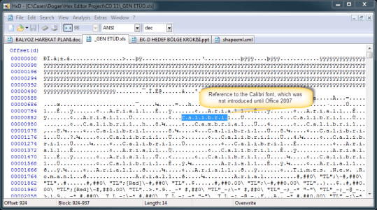 Bu belge adli bilişim araçları, ya da herkesin ulaşabileceği WinHex adlı programla açılınca, aşağıda görüleceği üzere, 2006 ortasına kadar varolmayan, ancak Office 2007 ile Microsoft Office’e dahil edilen Calibri fontuna referans taşıyor.
