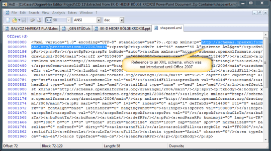Bu belge adli bilişim araçları, ya da herkesin ulaşabileceği WinHex adlı programla açılınca, aşağıda görüleceği üzere, 2006’ya kadar varolmayan, ancak Office 2007 ile Microsoft Office’e dahil edilen XML Şemasına referans taşıyor.