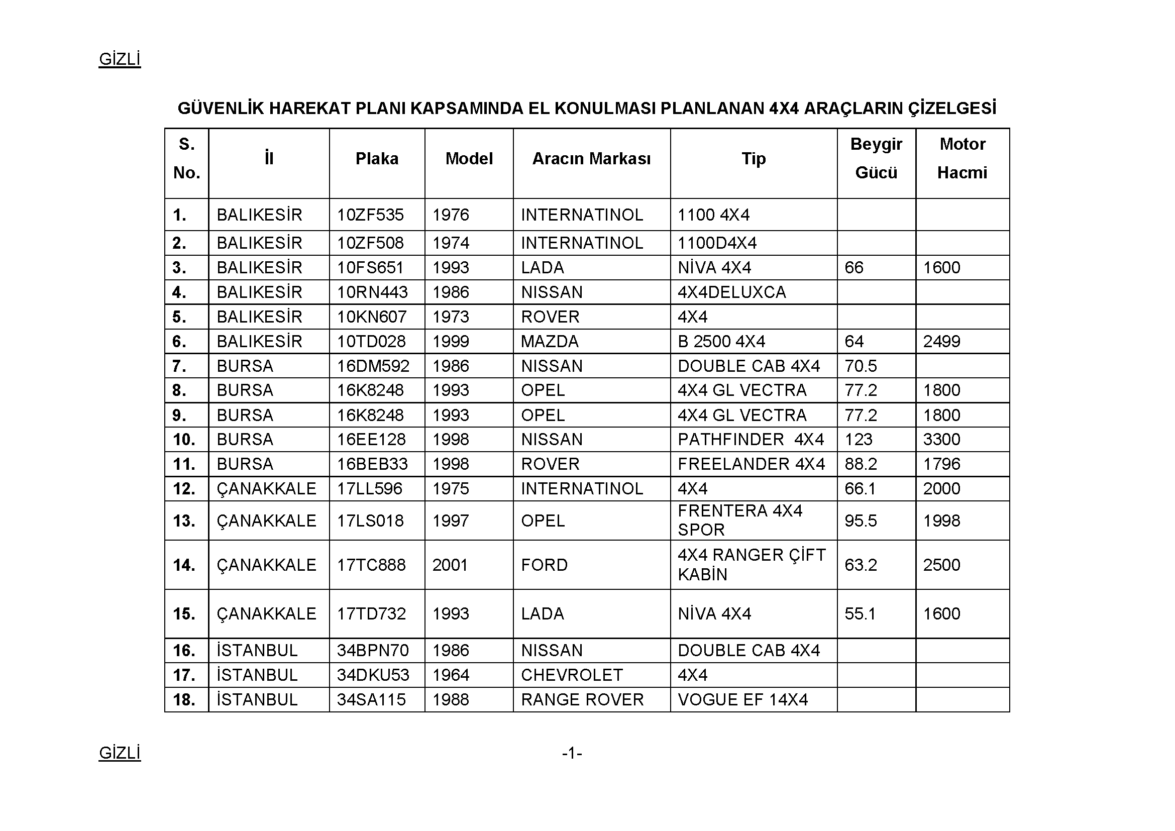 Sözü edilen belge, 4X4 ARAÇLAR ÇİZELGESİ.doc diğer Balyoz belgeleri ile birlikte 5 Mart 2003’de oluşturulmuş gibi görünen 11 numaralı CD’de yer alıyor. Belgeye buradan ulaşabilirsiniz.