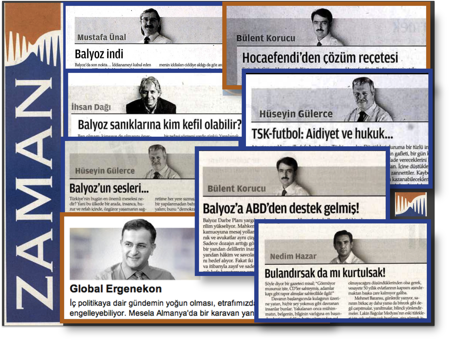 Sahtekarlar çetesi ile cemaati ilişkilendirmenin en dolaysız yolu Zaman gazetesinin yayınlarını incelemek. Zaman’ın Balyoz ve benzer davalarda yaptığı yayınlar öyle bir dezenformasyon sergiliyor ki, bu gazeteyle çete arasındaki ilişki insana Pravda’yla Sovyet komünist partisi arasındaki ilişkiyi anımsatıyor. Pravda, komünist partinin amaçları doğrultusunda nasıl yalan yanlış haber yapıyor ve her durumda kayıtsız şartsız destek veriyor idi ise, Zaman da aynı şekilde çetenin her türlü kirli işine arka çıkıyor.