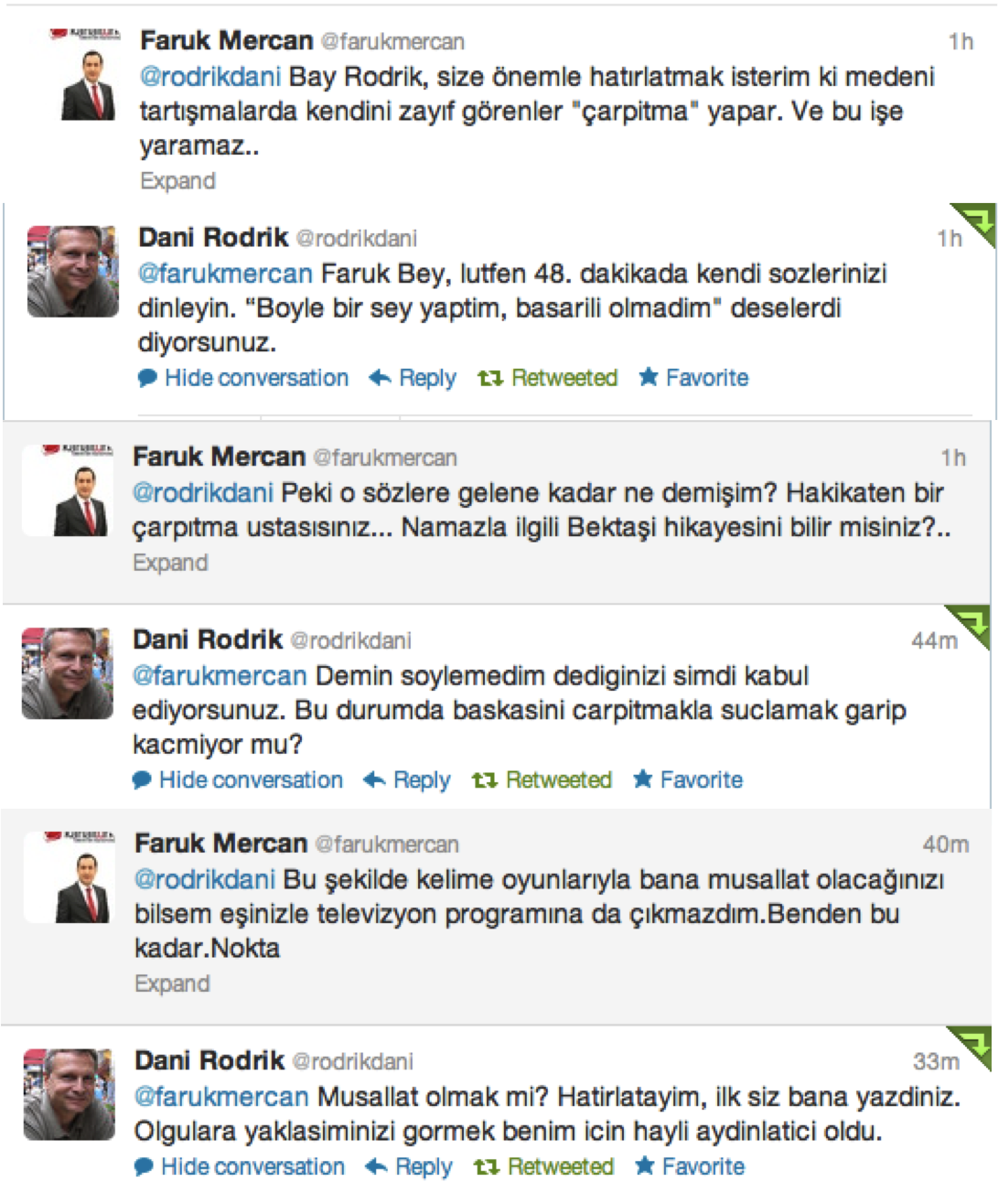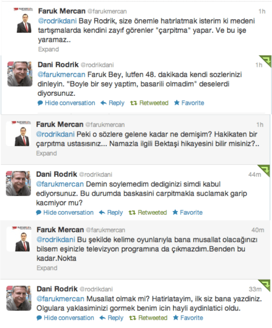 Sevgili Dani ve Pınar, Faruk Mercan programdan sonra keşke ben de Baransu ve Görmüş gibi yapsaydım da katılmasaydım pişmanlığını yaşıyor. Programı izleyenler açık ve net bir şekilde gerçeği gördü. Kendisi de ne güzel yazmış ” medeni tartışmalarda kendini zayıf görenler çarpıtma yapar” demiş. Biz kimin “çarpıtma” yaptığını gördük. Programa katılma hatasını sizin Twitter mesajınıza cevap vererek tekrarlıyor, battıkça batıyor.