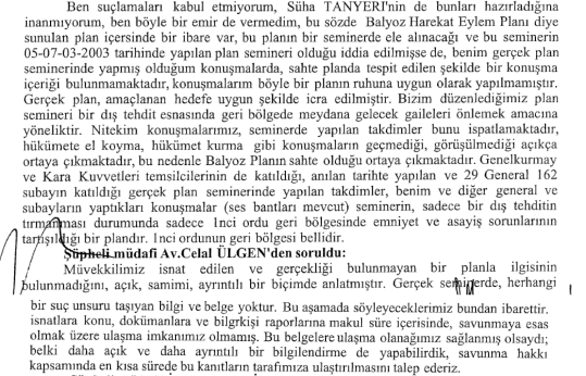 “Nitekim Çetin Doğan ilk sorgulamasında, Balyoz davasının konusu olan plan ve senaryoların Cumhuriyet’i koruma ve kollama görevinin gereği olarak hazırlandığını söylemişti.”
