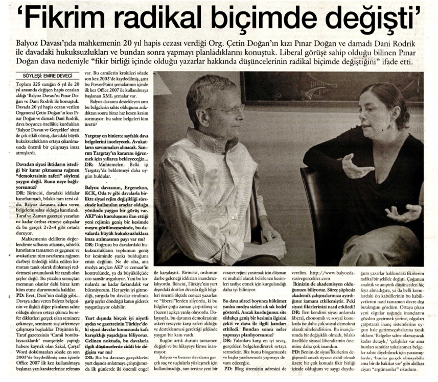 “Geçen Çarşamba’dan başlayarak, “Balyoz” kararları ve Türkiye’nin 2002-2007 arasında yaşadıklarının çeşitli boyutları hakkında ne düşündüğümü bir kere daha anlatıyorum. Ben “ama”sız memnunum’la, bir kere, bu cezaları neden haklı ve yerinde bulduğumu açıkladım. Sonra buna üç ek yapacağım dedim. (1) “Kin ve intikam” iddiasını eleştirdim. Ortada bir rövanşizm varsa, bunun, vesayet yanlılarının her göreli demokratikleşme adımından (ve bunların fikren önünü açan, bunları savunan ve destekleyen “liboş”lardan) intikam alma çabası olduğunu hatırlattım.